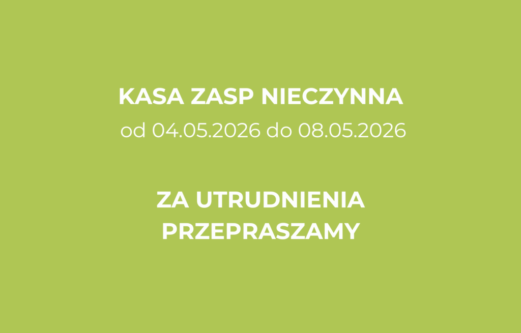 Od 04.05.2026 do 08.05.2026 kasa ZASP będzie nieczynna. Za utrudnienia przepraszamy.